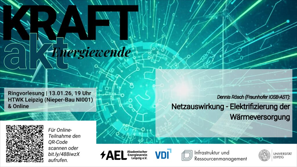 Wir freuen uns sehr, Dennis Rösch (Fraunhofer IOSB-AST) bei uns begrüßen zu dürfen. In seinem Vortrag „Netzauswirkung – Elektrifizierung der Wärmeversorgung“ gibt er spannende Einblicke in die Auswirkungen auf die Stromnetze und aktuelle Forschungsansätze.